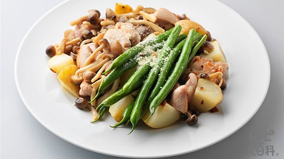 メインのチキンにはシスチンが、さやいんげんやじゃがいもにはビタミンCが豊富に含まれます。たんぱく質と野菜、食物繊維をバランスよく摂れるメニューです。