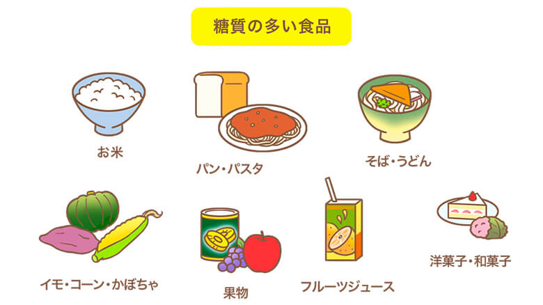 糖質が多い食品は、お米、パン・パスタ、そば・うどん、イモ・コーン・かぼちゃ、清涼飲料水、果物、フルーツジュース、洋菓子・和菓子などです。「主食」となる食品が多いのが特徴です。