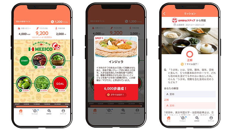 アプリを使い続けるユーザーにマイル(※)が加算されていくのも「aminoステップ」の魅力です。ウォークラリーをしたり、ミッションのクイズにチャレンジしたり楽しめます。