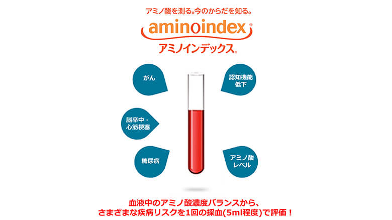 「「アミノインデックス」は、血液中のアミノ酸濃度バランスから三大疾病(がん、脳卒中・心筋梗塞)や認知機能低下、糖尿病などのリスクを評価し、その結果に基づき生活習慣に起因する疾病の発見や予防の機会創出をサポートし、健康寿命の延伸に貢献するサービスです。「aminoステップ」と連動させれば、「アミノインデックス」の検査結果を登録・閲覧できます。結果に合わせた生活改善ガイドの閲覧も可能です」