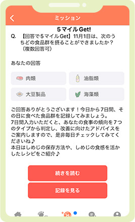倉本:以前から食事管理の機能が欲しかったので、食品研究所情報グループの「しっかり食べチェック®」は"渡りに船"でした。しかしこれを新機能という形で追加すると、これまでのアプリの使用に慣れていたユーザーが戸惑ってしまうことも想定されたため、既存ユーザーが使い慣れたミッションの形で食事入力を配信することにしました。名前も、機能を一目で理解できるように「かんたん食事ログ」にしました。