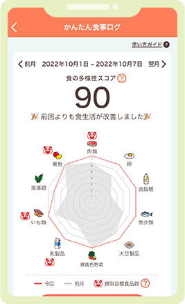 倉本:スコアのレーダーチャートの表示については、技術的に搭載しやすい折れ線グラフにする案もありましたが、ユーザーへのわかりやすさを重視して、レーダーチャートの案を貫きました。また、当初はスコア表示がありませんでした。レーダーチャートに前月のデータを表示したり、「アジパンダ®」のイラストを表示したりするようになったのも、改修以降のことです。そのほか、ボタンの配置や表示されるメッセージなども細かく変更しています。