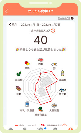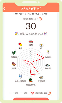 入力結果がレーダーチャートに表示されると、自分に足りていない食品群が一目瞭然!スコアも出るので、モチベーションも上がります。不足している食品群を補ってくれる料理レシピの紹介もうれしいところ。翌日の献立選びにすぐにでも使えそうです。