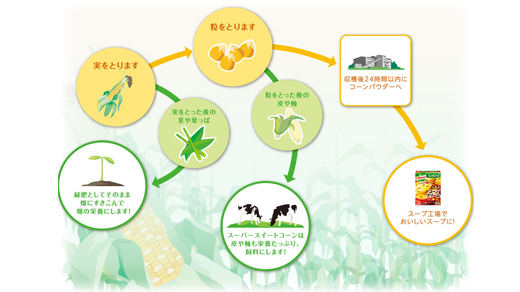 さらに、うま味調味料「味の素®」の製造過程でできる副生物から肥料を生み出す取り組み「バイオサイクル」を行っており、「クノール®カップスープ」においても、原料であるスーパースイートコーンの茎や葉、軸や皮にいたるまでを丸ごとムダなく活かし切ることで持続可能な農業・畜産業の実現にも貢献しています。