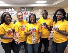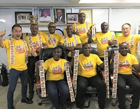 1回分ずつ個別包装され長期間保存可能な乾燥粉末調味料「DeliDawa™」を手にするナイジェリア味の素食品社の担当メンバー。