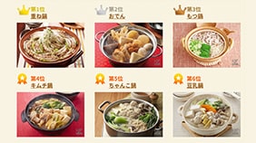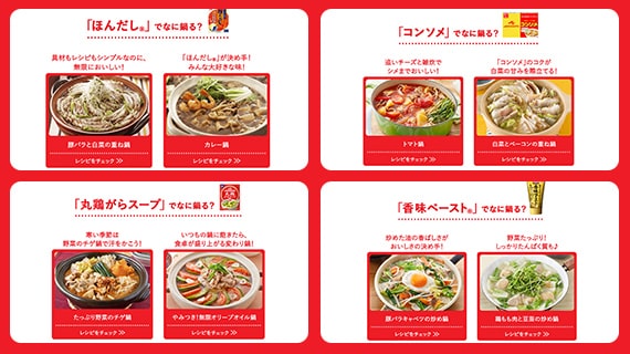 定番の「ほんだし®」「丸鶏がらスープ」「コンソメ」をはじめ、人気の「香味ペースト®」「鍋キューブ®」など、お鍋のアレンジに欠かせない調味料とともに、今夜食べたいおすすめのお鍋が見つかるはず。