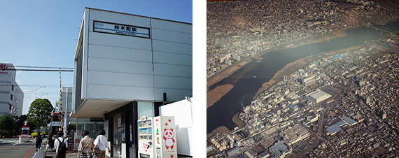 画像左:駅の向こう側に見えるのが川崎工場の入り口。画像右:鈴木町を中心としたエリアを俯瞰から見た写真。