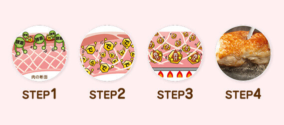 酵素が肉の繊維をほぐし、繊維の間に入り込んだ細かいでんぷんが肉汁を逃さずキャッチ。だから、やわらかくてジューシーに仕上がるというわけです。
