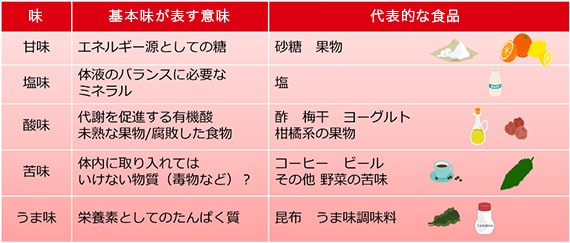人は、舌で「甘味」、「塩味」、「酸味」、「苦味」、そして「うま味」という5つの基本味を感じます。これら基本味は、危険な食物を避け、安全に栄養を摂るという、生きるためにとても大事な情報です。たとえば、食べたときに「甘味」を感じれば、その食べ物はエネルギーのもと、「塩味」を感じればミネラルのもとと感じ、好ましい味として認識します。反対に、食べ物は腐敗すれば「酸味」を、毒であれば「苦味」を持つため、人はそれらを体にとりこむ前に危険を察知することが出来ます。さらに、「うま味」は、生きていくのに必要なたんぱく質を摂っていることを体に知らせるシグナルのような役目をしているため、人は「うま味」を好ましい味として認識するのです。