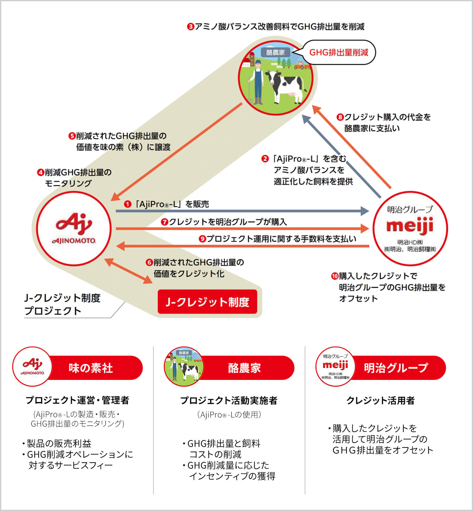 2023年(令和5年)、味の素社は、明治グループと協業し「AjiPro®-L」とJ-クレジット制度を活用した、GHG排出量削減と経済価値の創出を両立するビジネスモデルを構築しました。