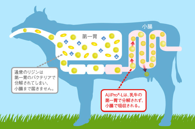しかし、牛は4つの胃を持つ反芻動物で、リジンをそのまま飼料に添加すると第一胃(ルーメン)でバクテリアにほとんど分解されてしまい、栄養として吸収される小腸まで届きません。