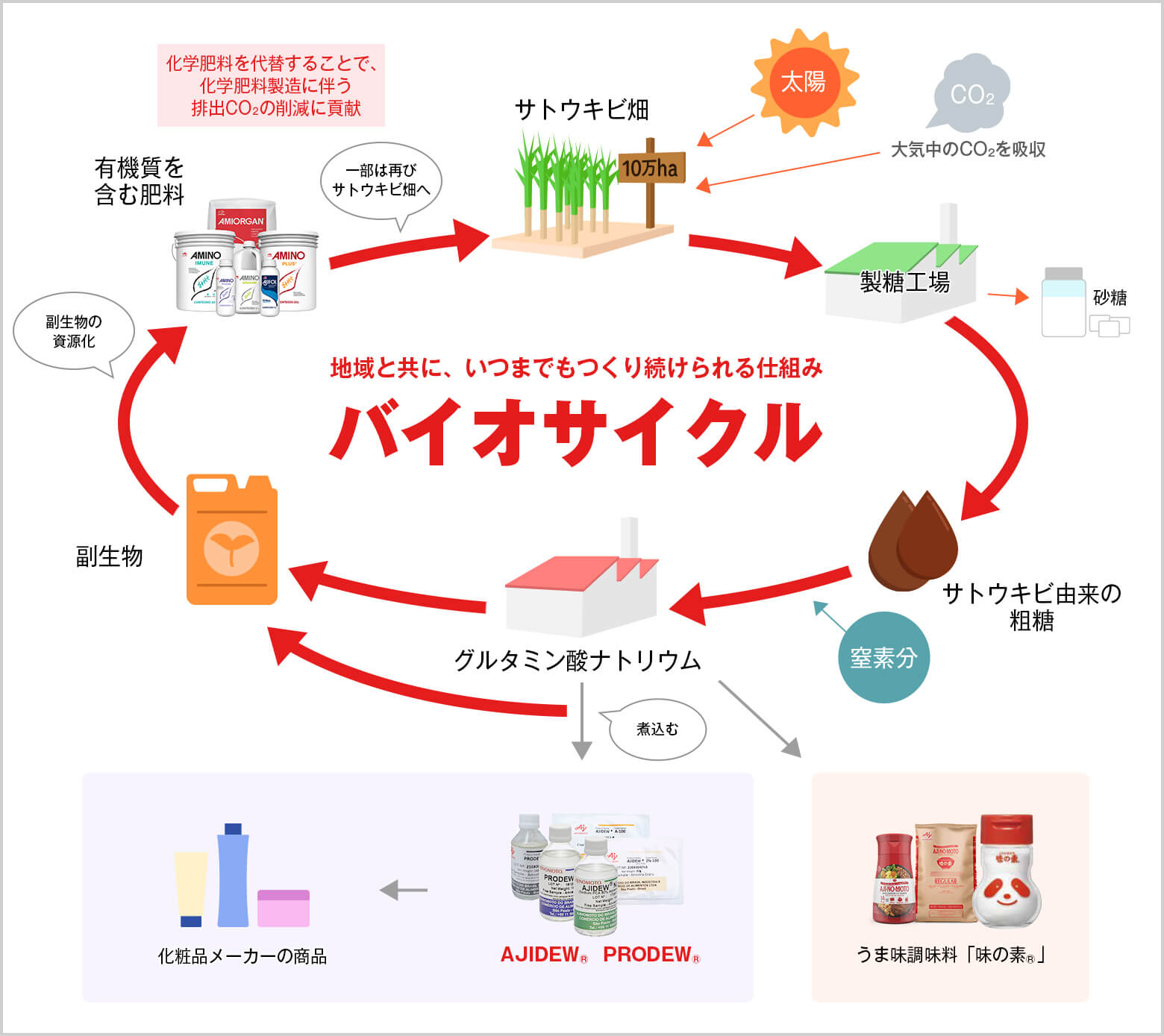 まとめると、味の素社では「製造時に残った副生物を廃棄せず、農作物の肥料として再利用するという」資源循環型の製造システム「バイオサイクル」を活用しており、「AJIDEW®」はこの「バイオサイクル」によって製造されています。