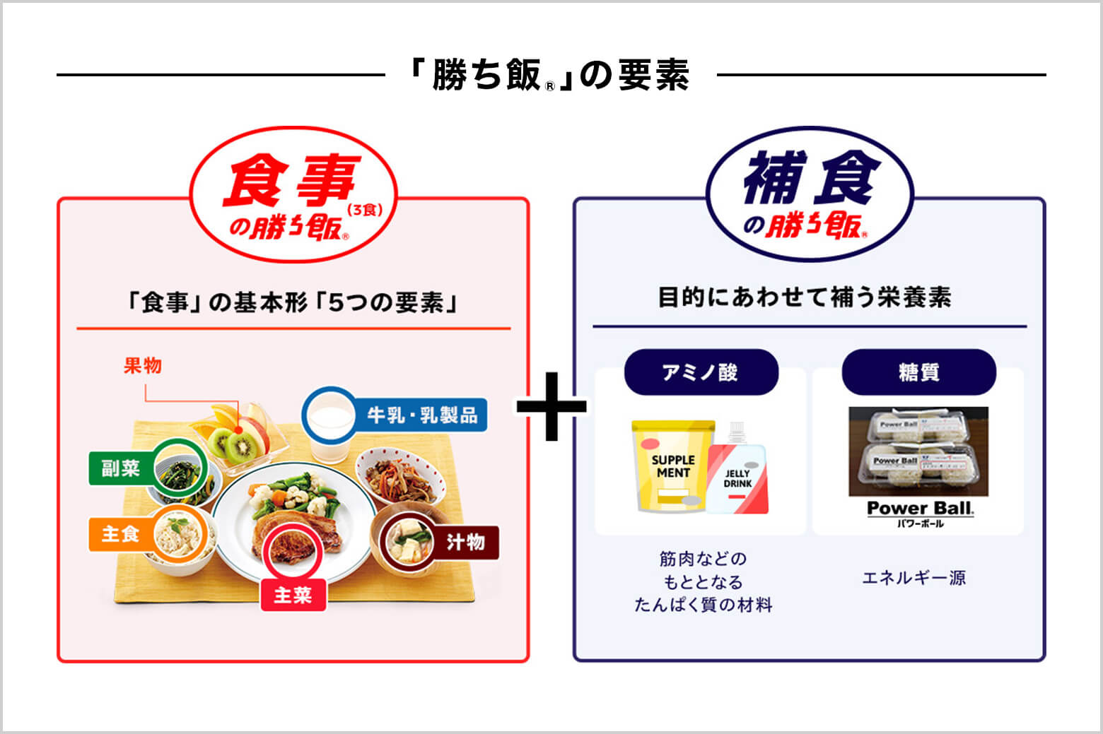「勝ち飯®」は、3食の「食事」と目的にあわせて必要な栄養素を補う「補食」から成り立っています。