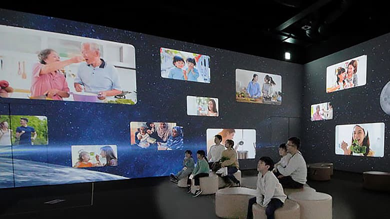 まず最初は、四方壁面がスクリーンとなったシアターへ。製品の要でもある"うま味"が自然の恵みから作られていること、バランスよく食べることは、体をつくるうえで大切なことなどを、360度の迫力映像で体感できます。