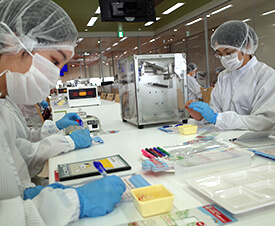 参加者は全員、白衣、キャップ、マスク、手袋を身につけ、滅菌用のエアシャワーをくぐり、クリーンルームの中で作業を行います。機械に瓶をセットして、機械から出てくる製品をしっかり計量し、包装、検品などを体験することで、清潔と安全を徹底することの大切さや、手軽に買える製品がいかに繊細な工程をたどって届けられているのかを実感できます。