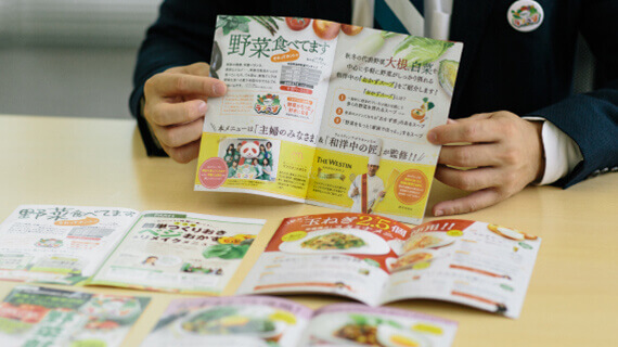 若手営業担当の小寺悠太は、スーパーなどと協力して「野菜の売上アップ」を目標のひとつに設定し、メニューブックの制作に乗り出しました。