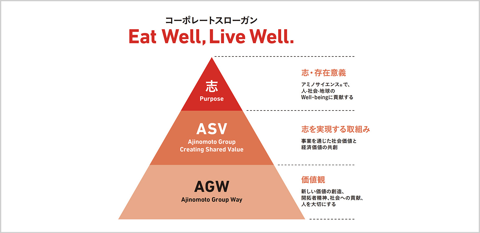 この取り組みをASV(Ajinomoto Group Creating Shared Value)と称し、ASVをミッションとビジョンを実現するための中核と位置付けた理念体系を"Our Philosophy"として設定しています。