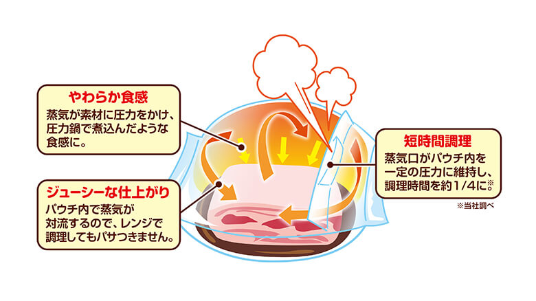 「時間のかかるチャーシューを、短時間で」という思いで開発された「スチーミー®」は、味の素社初となる"圧力スチーム調理パウチ"。調味料入りのパウチにお肉を入れてレンジで加熱すると、蒸気でパウチが膨らむ仕組みになっています。