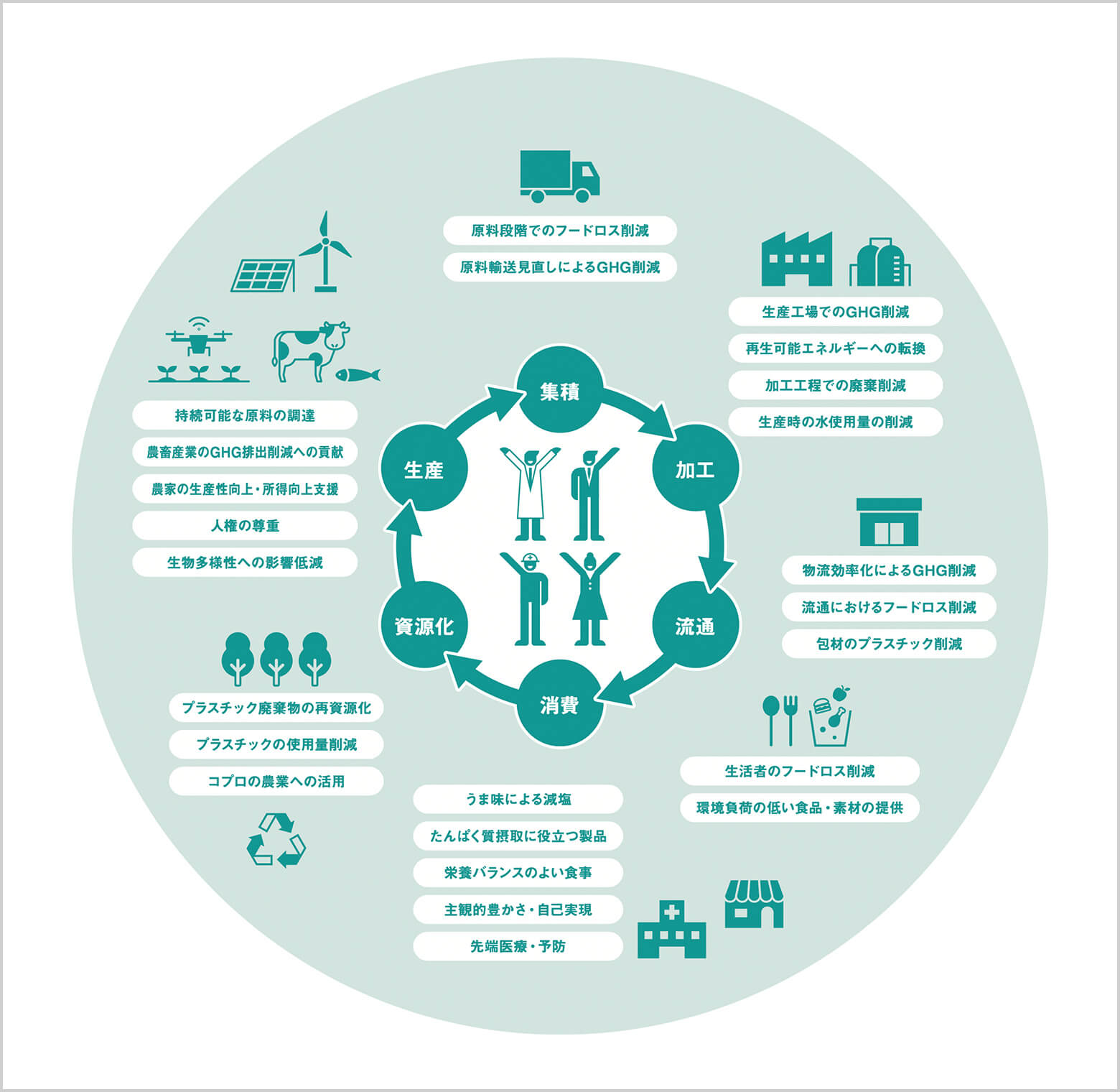 味の素グループは事業を通じて、おいしくて栄養バランスのよい食生活に役立つ製品・サービスを提供するとともに、温室効果ガス、プラスチック廃棄物、フードロスなどによる環境負荷の削減をより一層推進します。また、資源循環型アミノ酸発酵生産の仕組み(バイオサイクル)を活用することで、レジリエントかつ持続可能なアグリフードシステムと地球環境の再生に貢献していきます。
