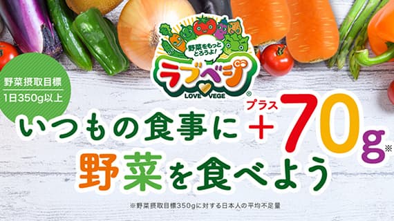「ラブベジ®」とは、「野菜をもっととろうよ!」をスローガンに、国(厚生労働省健康日本21)が推奨する「野菜の摂取目標1日350g以上」の実践を応援するための、味の素株式会社のプロジェクトです。