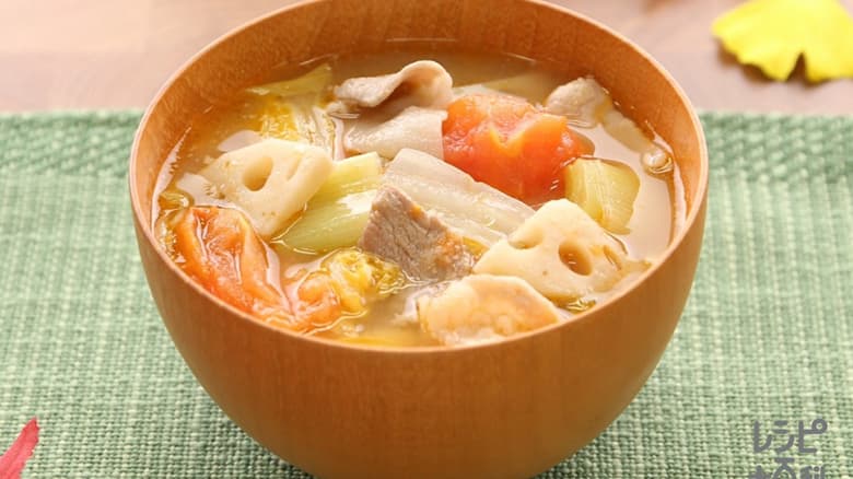 本県が推進する「野菜くまモリ運動」との連携では、コラボレシピ「野菜くまモリみそ汁」を開発。熊本県特産の「トマト」「レンコン」を使った具沢山のみそ汁で、「野菜くまモリ」メニュー基準に沿って、一皿(一椀)で一日に必要な野菜(350g)の半分にあたる、野菜175gが摂れるというものです。
