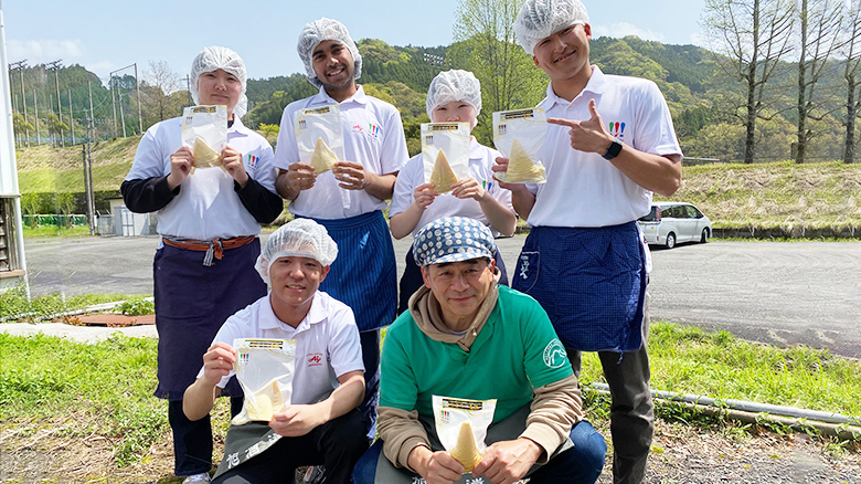 大分県でのタケノコ加工の様子。前列左が若林さん。