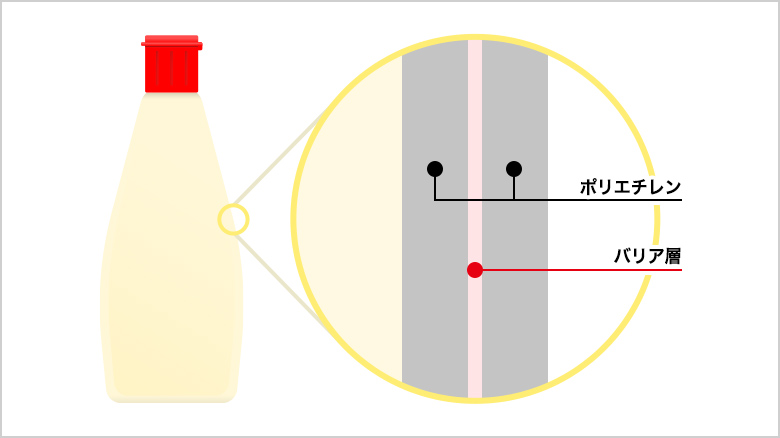 マヨネーズは、空気中の酸素により、作りたてのおいしさが損なわれてしまうため、 マヨネーズボトルは一般的に酸素の侵入を防ぎ品質を守るためのバリア層と、ポリエチレンという素材でできています。