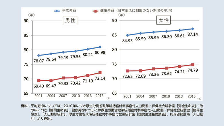 出典:厚生労働省「平均寿命と健康寿命の推移」(https://www.mhlw.go.jp/stf/wp/hakusyo/kousei/19/backdata/01-01-02-06.html)を加工して作成