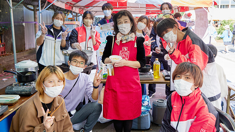 「LOW SALT CLUB」部長のジョーさん。さんをはじめとした部員が、学生たちとアイデアを出し合い、うま味調味料「味の素®」を活用したレシピを考案。チヂミ、カルボナーラうどん、やきそば、豚汁など、学園祭でも定番のメニューや麻布大学オリジナルメニューで、「おいしい減塩」にチャレンジしました。もちろん、いずれのメニューも大好評につき完売!でした。