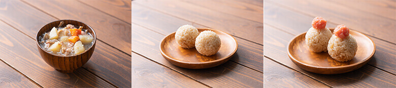 カフェのメニューの「エネルギー豚汁」(左)、「だし結び」(中)(右)。