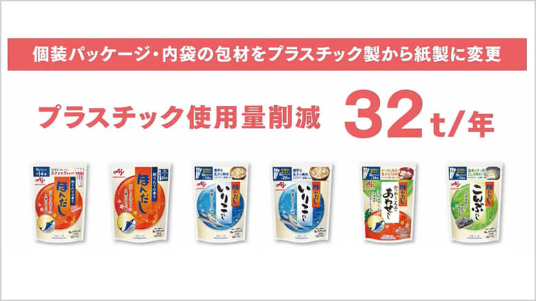 2023年(令和4年)の春に「ほんだし®」スティック品種の包材を紙化。この改定により、プラスチック使用量32トンの削減をはかります。