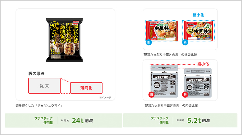 「ザ★®シュウマイ」や「野菜たっぷり中華丼の具」では、パッケージの省資源化を進めています。
