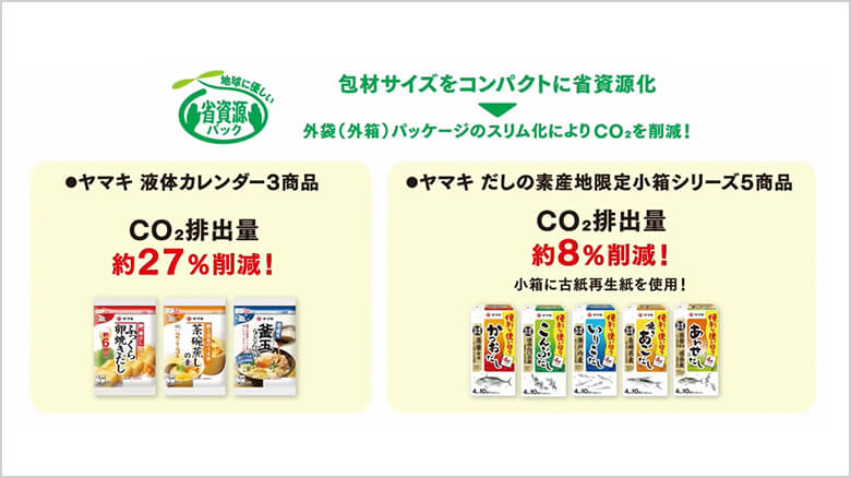 少量使い切りタイプの「讃岐風釜玉うどんつゆカレンダー」「ふっくら卵焼きだしカレンダー」「茶碗蒸しの素カレンダー」の3商品は、パッケージをコンパクトにすることで省資源化、だしの素産地限定小箱シリーズは箱のスリム化を行う事でCO2排出量を削減しています。