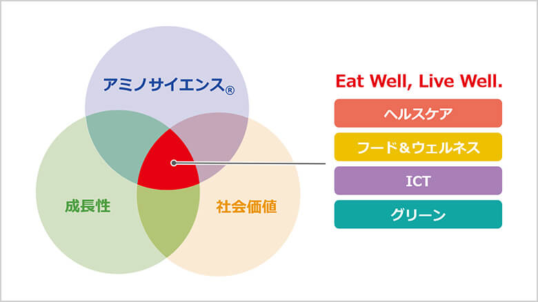 この目標に向けて、4つの成長領域をどのように進化させていくかということが大事です。たとえば現在の事業を「フード&ウェルネス」という提供価値にするために、どのように進化させるかを考える。これはあらゆる可能性に満ちていると思います。