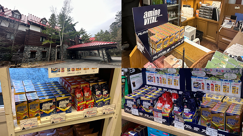 おかげさまで上高地ではバスターミナルの売店をはじめ、上高地帝国ホテル、白樺荘、徳澤園、横尾山荘さんなど19すべてのホテル、旅館、山小屋に「アミノバイタル®」を置いてもらうことができました。