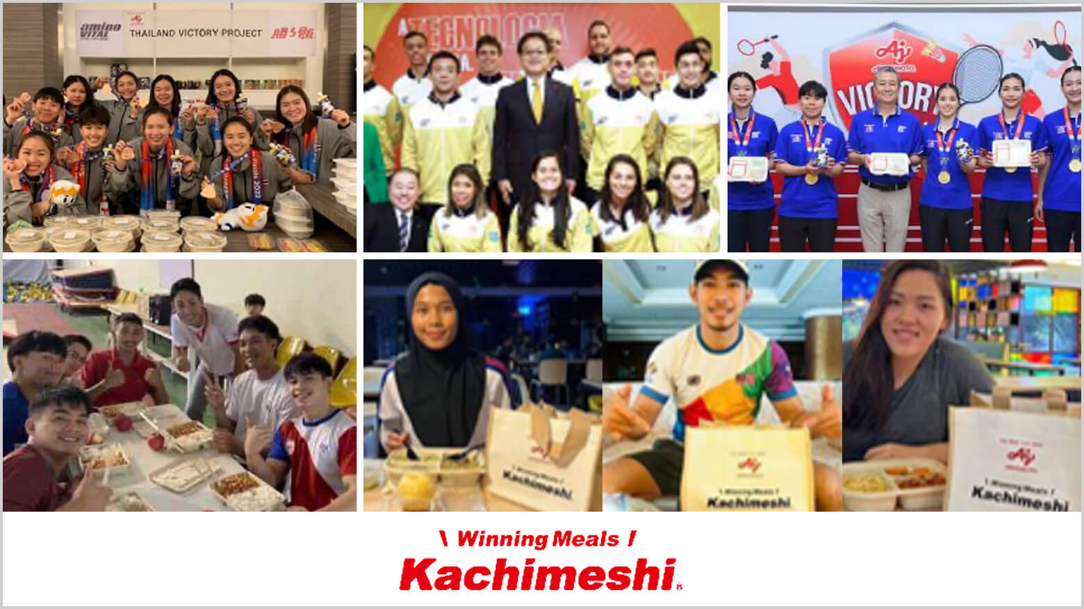 現在は、代表選手を「アミノバイタル®」や「Kachimeshi®」でサポートしているほか、タイの女子バドミントン代表選手、フィリピンの体操選手、マレーシアの3選手にも、それぞれ「アミノバイタル®」や「Kachimeshi®」でサポートしています。
