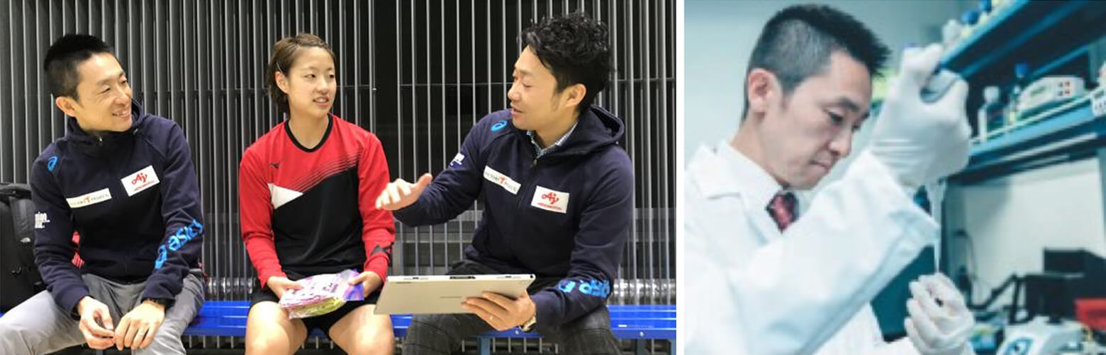 さらに、個別の課題解決のために、サイエンスベースのアプローチが行えるよう、味の素社の研究所に所属する科学者もプロジェクトに参加。選手やコーチと打ち合わせをしながら情報を収集するサポート担当スタッフが、管理栄養士や科学者と情報共有しながら解決策を構築しています。