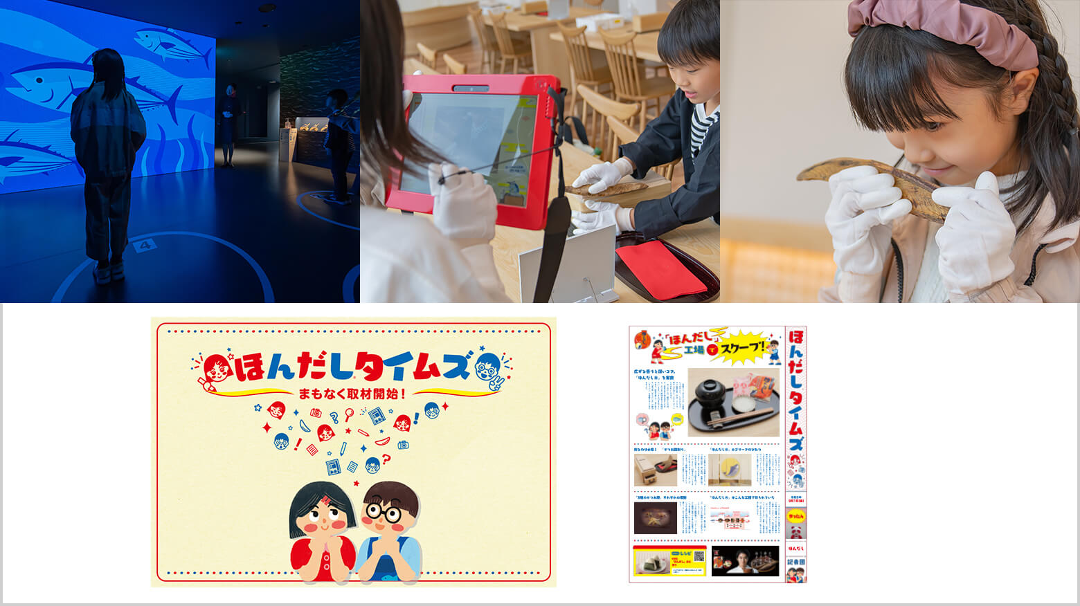 見学者は新聞記者になりきって、「ほんだし®」のひみつを探ります。みそ汁の試飲やかつお節削り体験など、コースの合間合間にシャッターチャンスが訪れるので、各グループに支給されたタブレット端末で撮影。こうして"ネタ集め"していき、最後に「ほんだしタイムズ」を完成させる仕掛けです。大人も子どもも「特ダネ」を逃すまいと、夢中になって撮影されるんですよ。