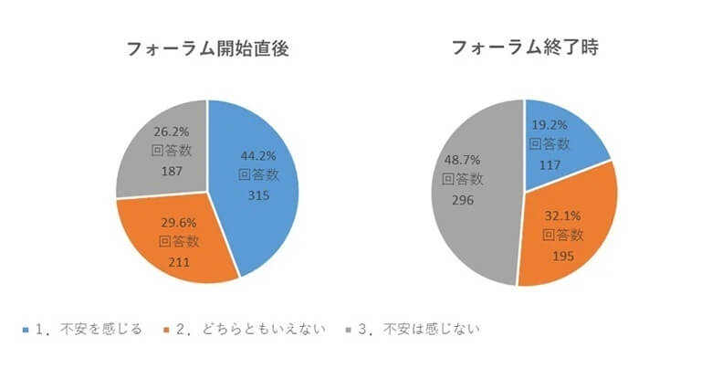 食品添加物へのみなさんの関心は高く、多くの質問がよせられました。また、フォーラム開始直後と終了時では、食品添加物に対する不安の感じかたにも変化がみられました。