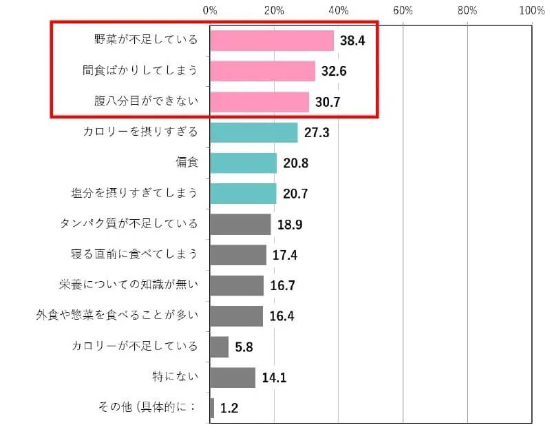 なりたい体型への理想があるなか、食事、食生活に関して気になっていることについては、「野菜が不足している」38.4%、「間食ばかりしてしまう」32.6%と、食への課題意識は高い傾向にあることが明らかに。