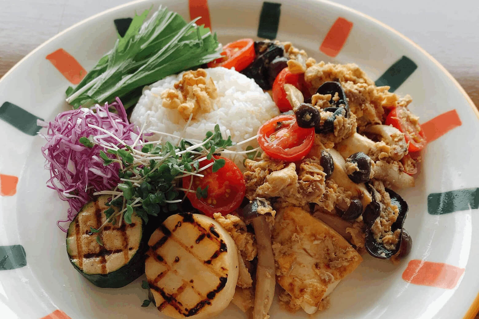 ⑩ ご飯を盛った器に⑨を盛り付け、紫キャベツ、スプラウト、水菜、⑤のズッキーニを添え、刻みのりを散らす。