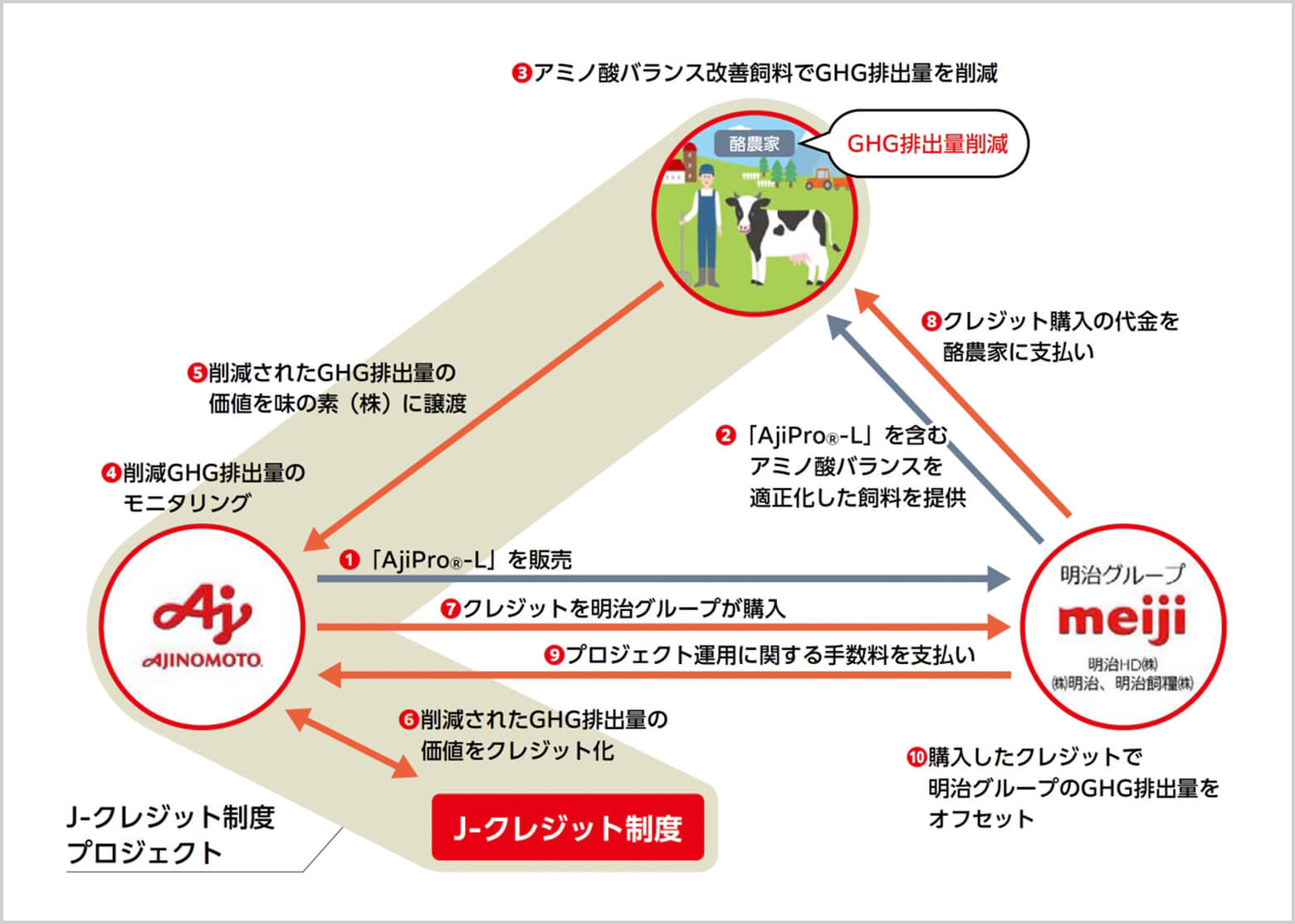 味の素社は、明治グループの飼料会社に「AjiPro®-L」を販売する。明治グループは契約している酪農家に「AjiPro®-L」を混ぜ合わせた飼料を販売する。