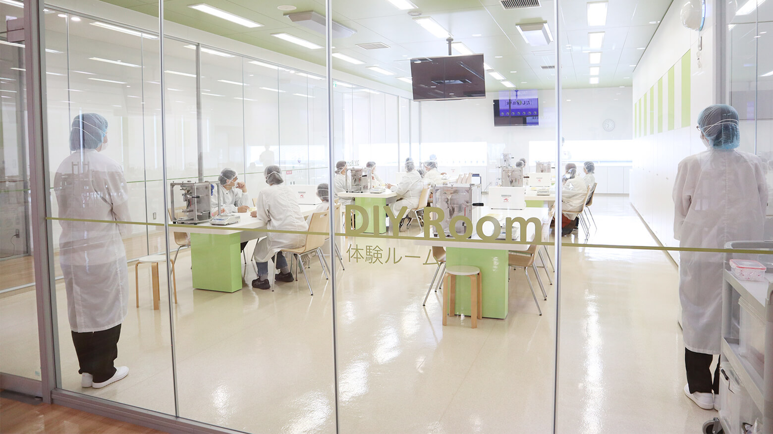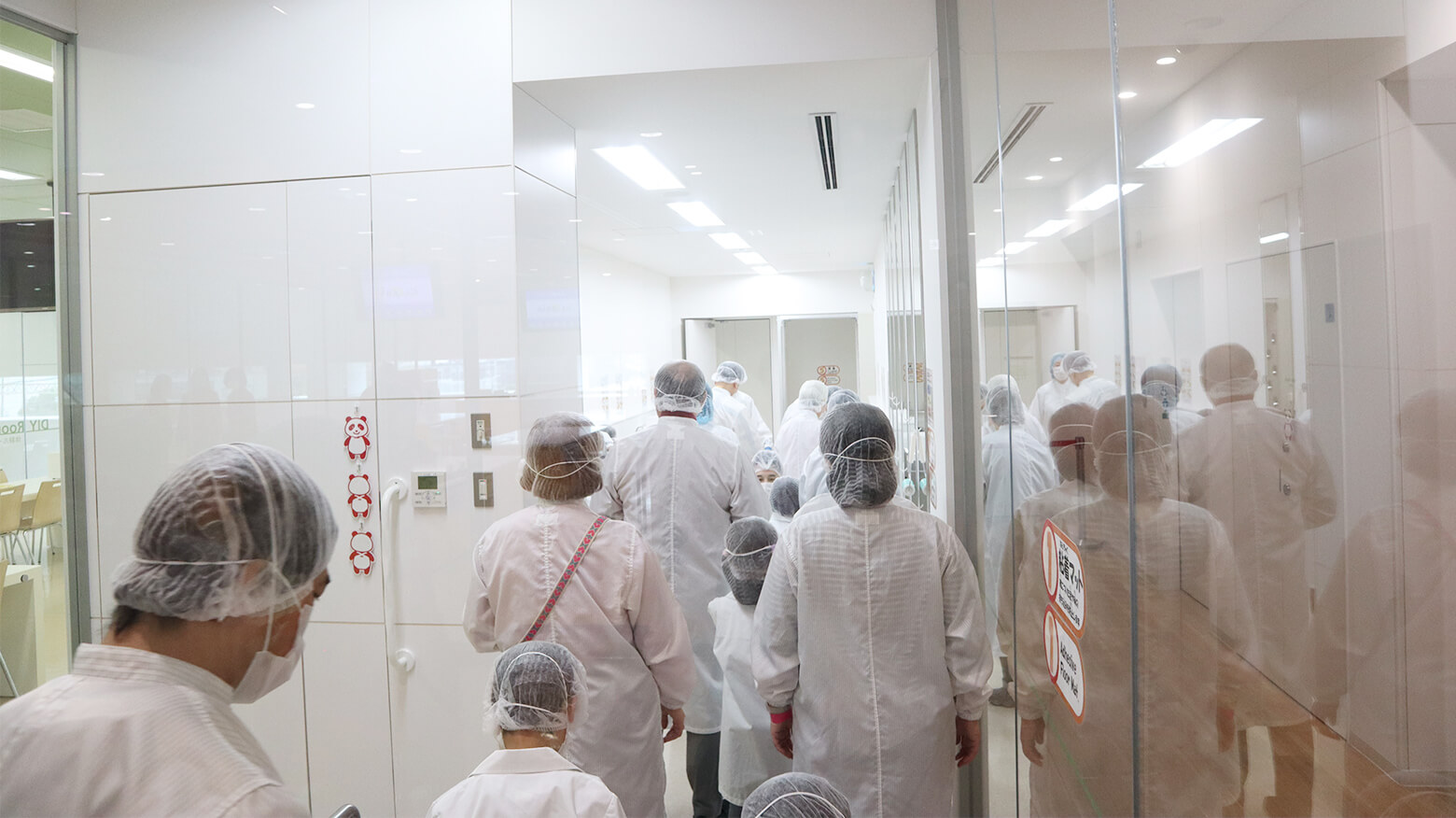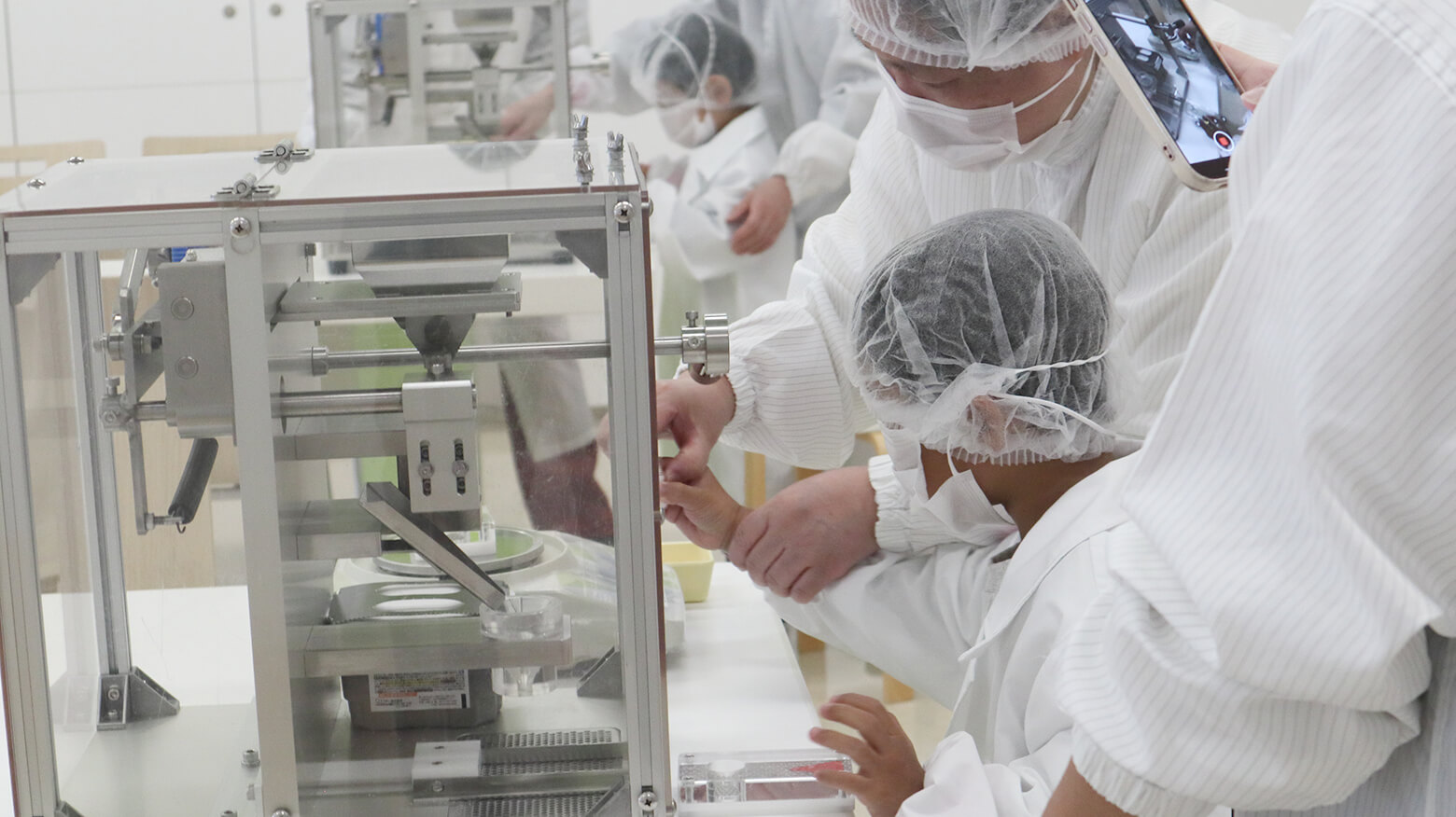 参加者は全員、白衣、キャップ、マスク、手袋を身につけ、滅菌用のエアシャワーをくぐり、クリーンルームの中に入ります