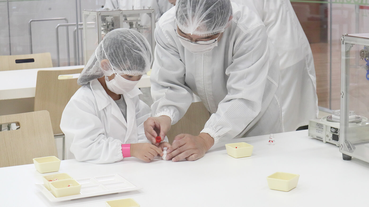 機械に瓶をセットして、機械から出てくる製品をしっかり計量し、包装、検品などを体験します