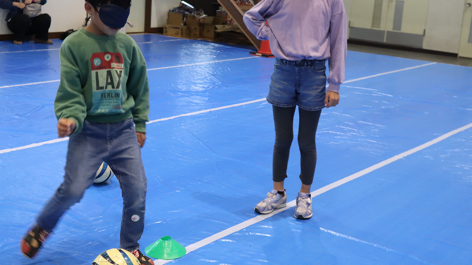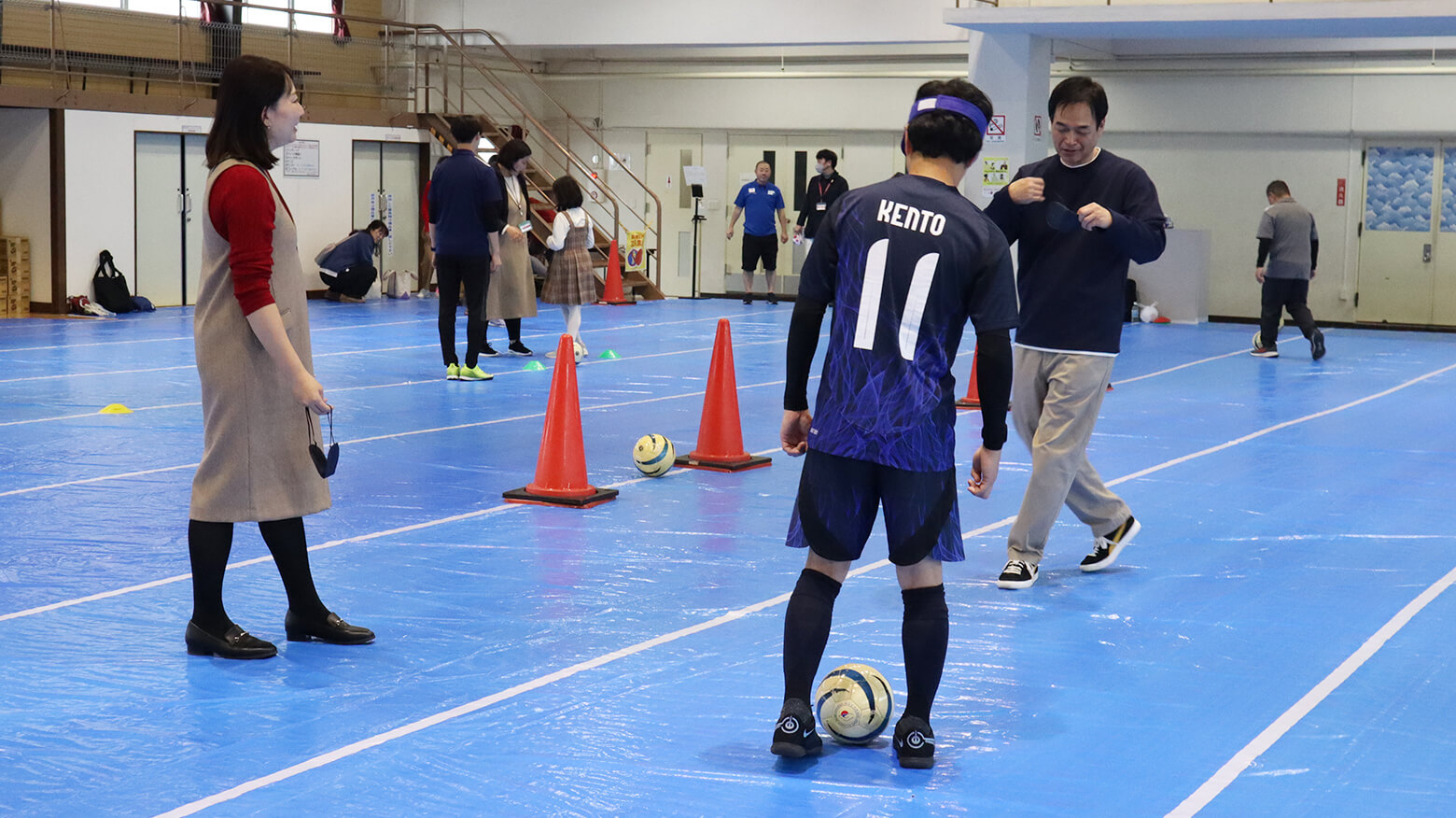 体育館では、ストーリーの記事や動画にも登場いただいたブラインドフットボール(ブラインドサッカー®)パリ2024パラリンピック日本代表の鳥居健人選手(参天製薬株式会社)をゲストに招き、来場者とともにブラインドサッカー体験を行いました。