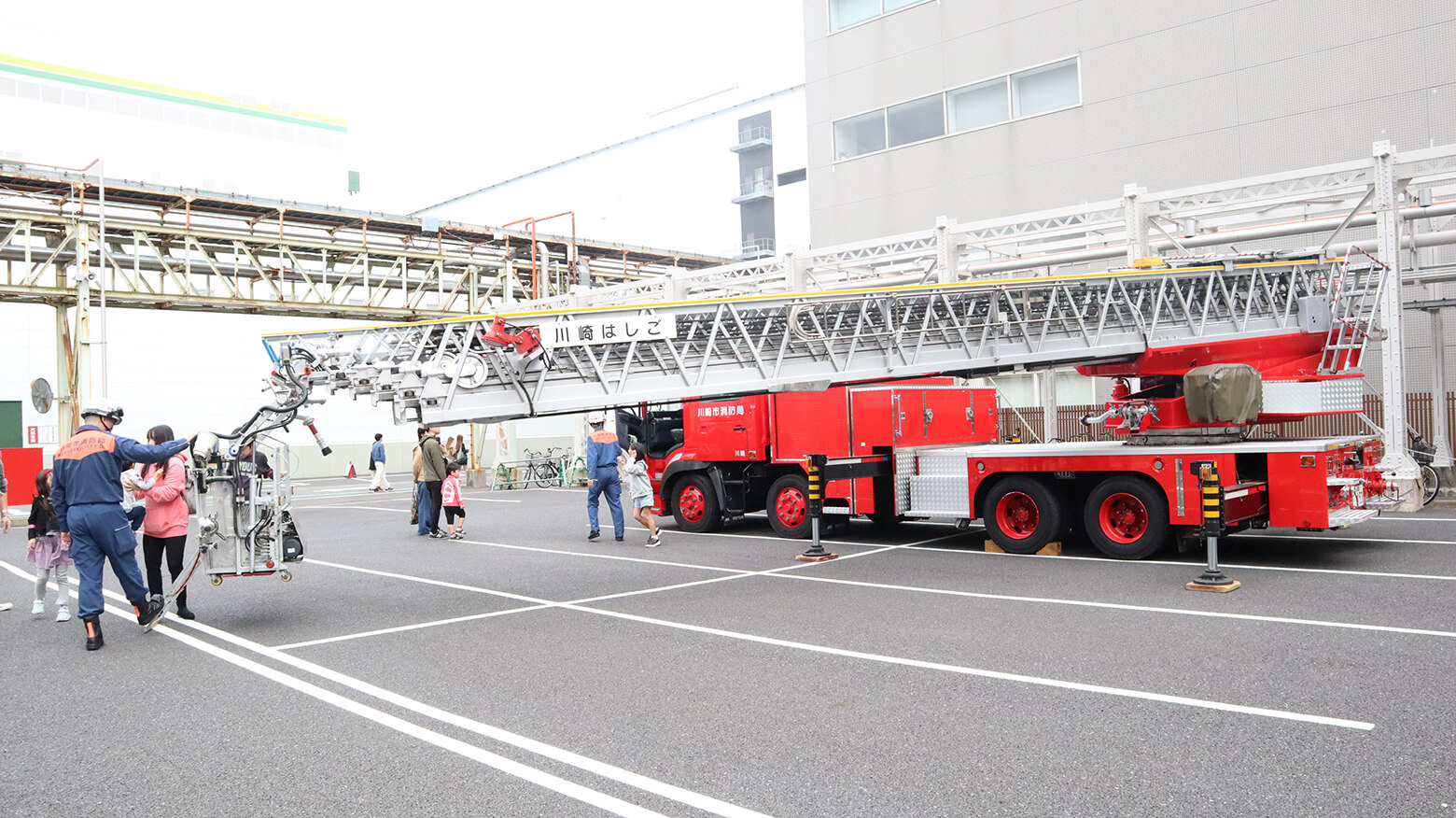 危険物を扱う工場運営に関わる防災・安全において、川崎事業所は川崎市消防局とも日頃から連携しており、今回の「あじ祭り」では、はしご車の展示や救急車・地震を体験するための起震車の出動のほか、水による消火体験などを行いました。