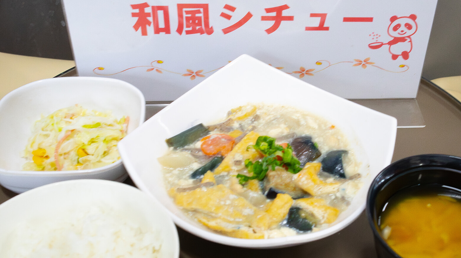 食堂では3種類のランチを販売、取材陣は写真の「崩し豆腐の和風シチュー」をいただきました