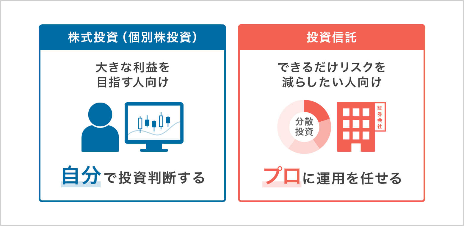個別株に投資する株式投資は自分で投資判断するのに対し、投資信託は証券会社を通じて専門家に運用を任せます。