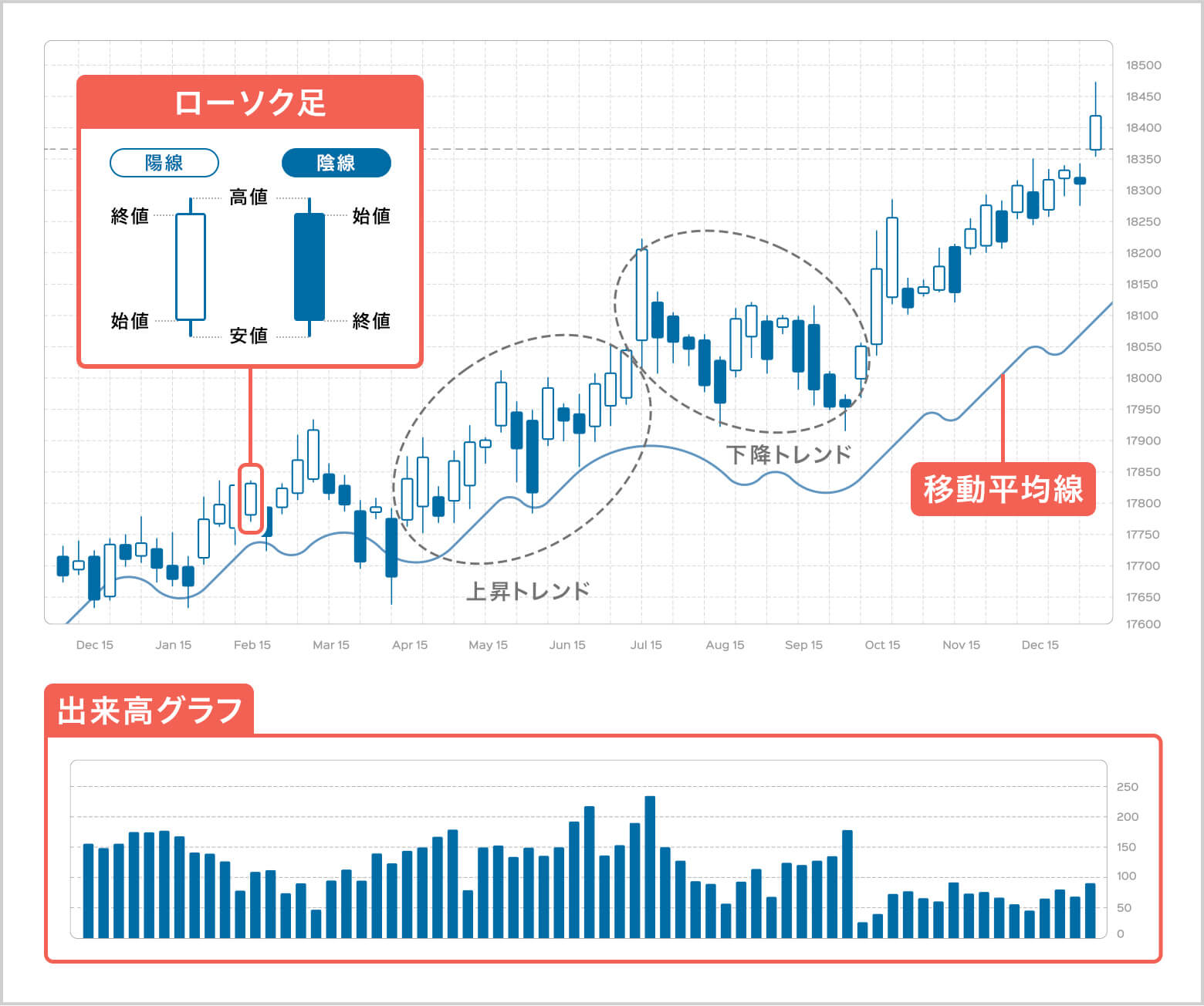 チャートは「ローソク足」「出来高の棒グラフ」「移動平均線」の3つの要素で構成されています。