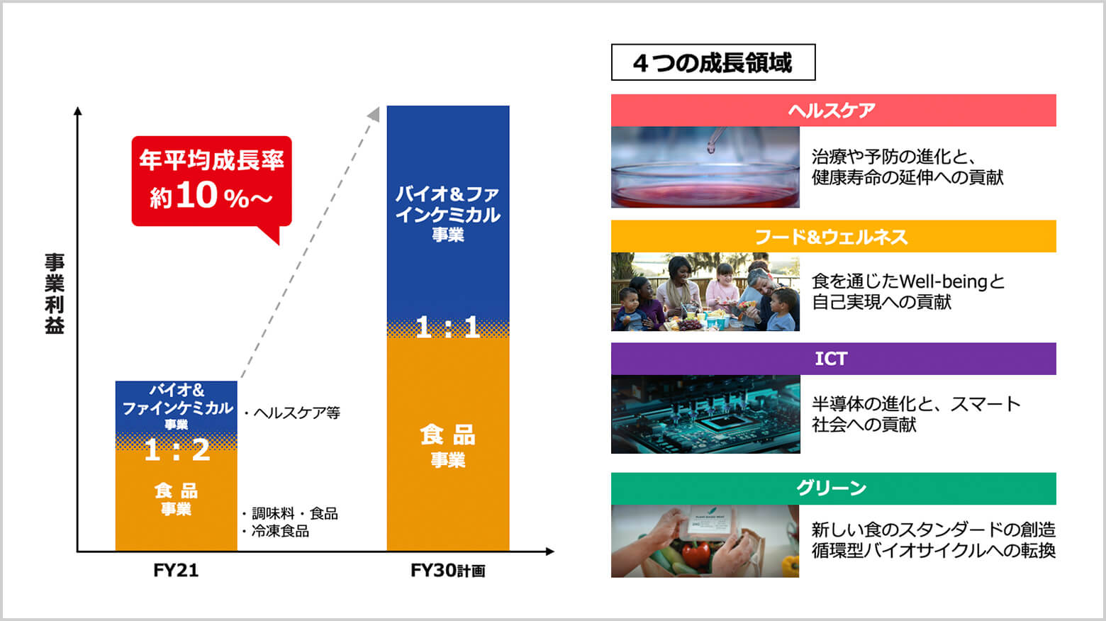 食品事業を持続的に成長させながら、このような事業を含むバイオ&ファインケミカル事業をさらに伸ばし、2030年には、食品事業とバイオ&ファインケミカル事業の事業利益を1:1にするという目標を掲げています。